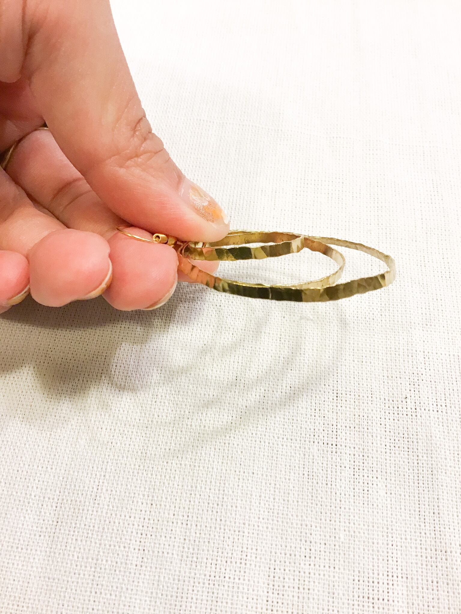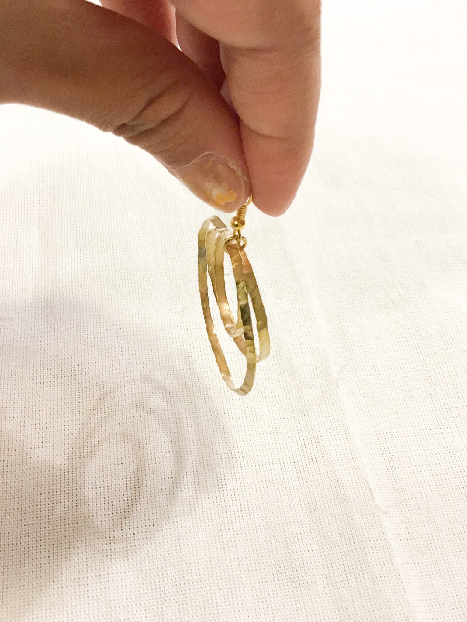 打ちっぱなしの手仕事がとても繊細に現れている3連サークルモチーフです。ふいに見えるサークルのいびつさが、お洒落な抜け感をプラスしてくれます。