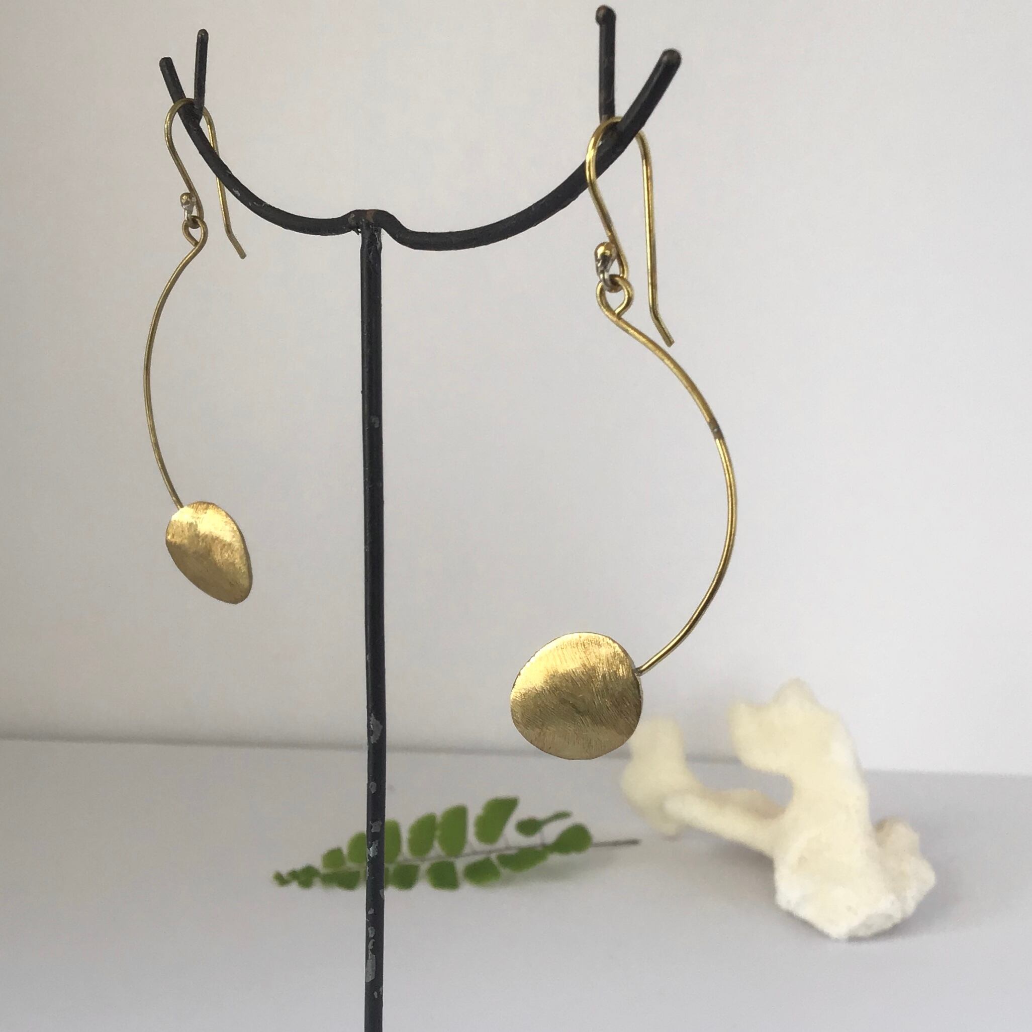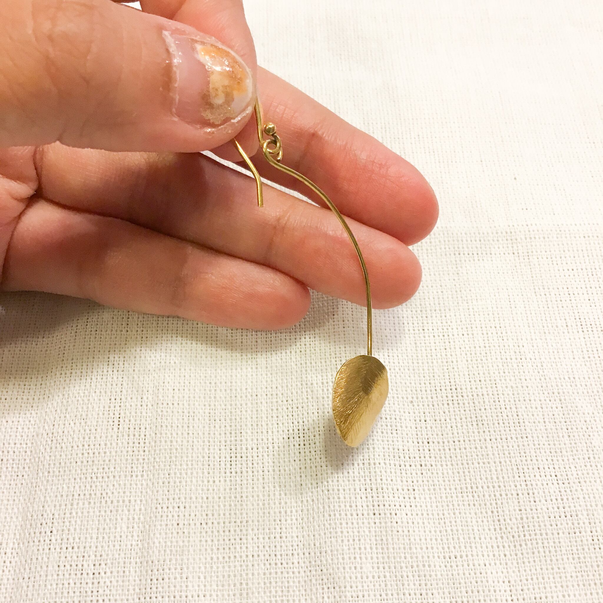 チェリーのような揺れ感と、真鍮の無骨さが相まって、個性的につけていただけます。板状のサークルモチーフは固定されているので、カジュアルに気軽につけやすいです。