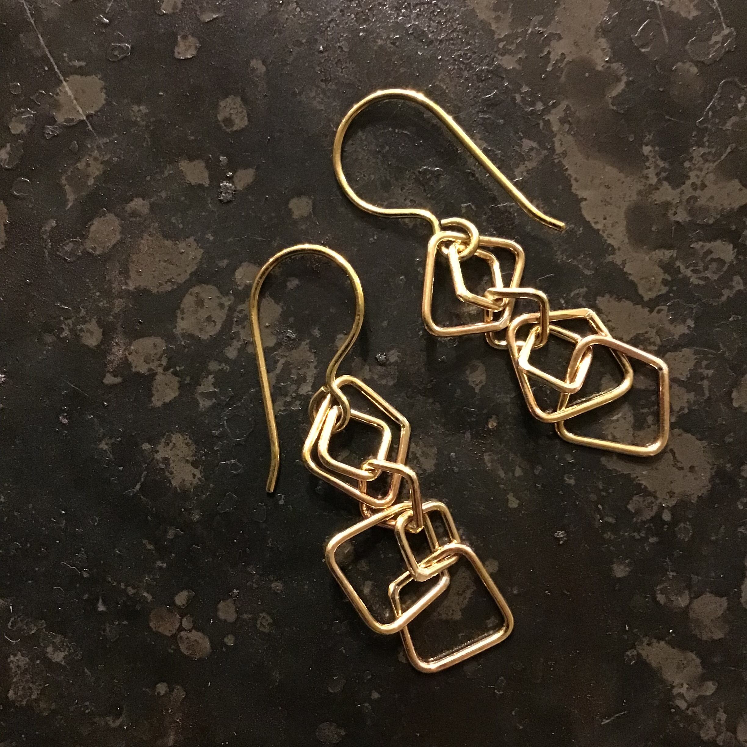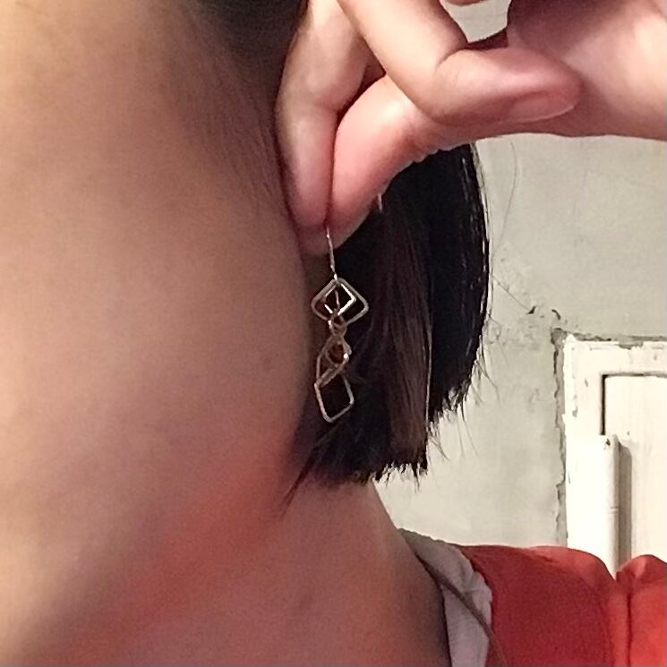 ダイヤ型と、いびつな四角形が6個組み合わさったぶら下がりタイプのピアスです。さりげなさと個性が融合したオシャレなデザインで仕上げています。