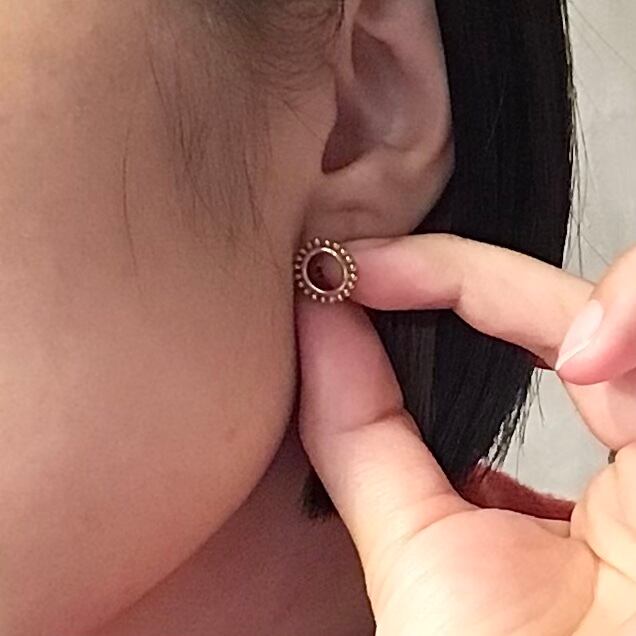 サークルモチーフのフチにボールモチーフを装飾するだけで、ガーリーな雰囲気に。真鍮素材なので、ガーリーなだけでなく、クラシカルで上品な要素もミックスされます。キャッチタイプですので、カジュアルにもご着用いただけます。