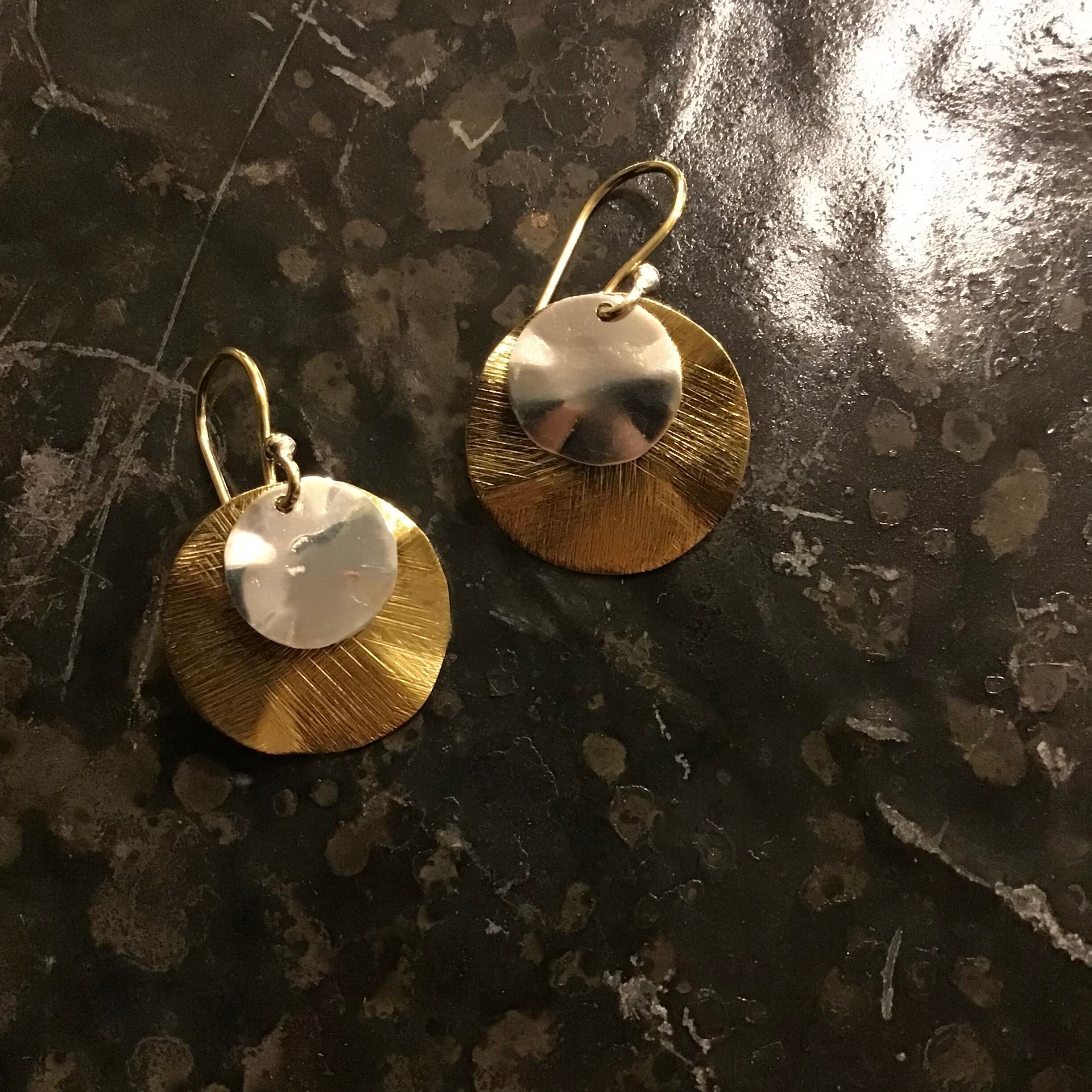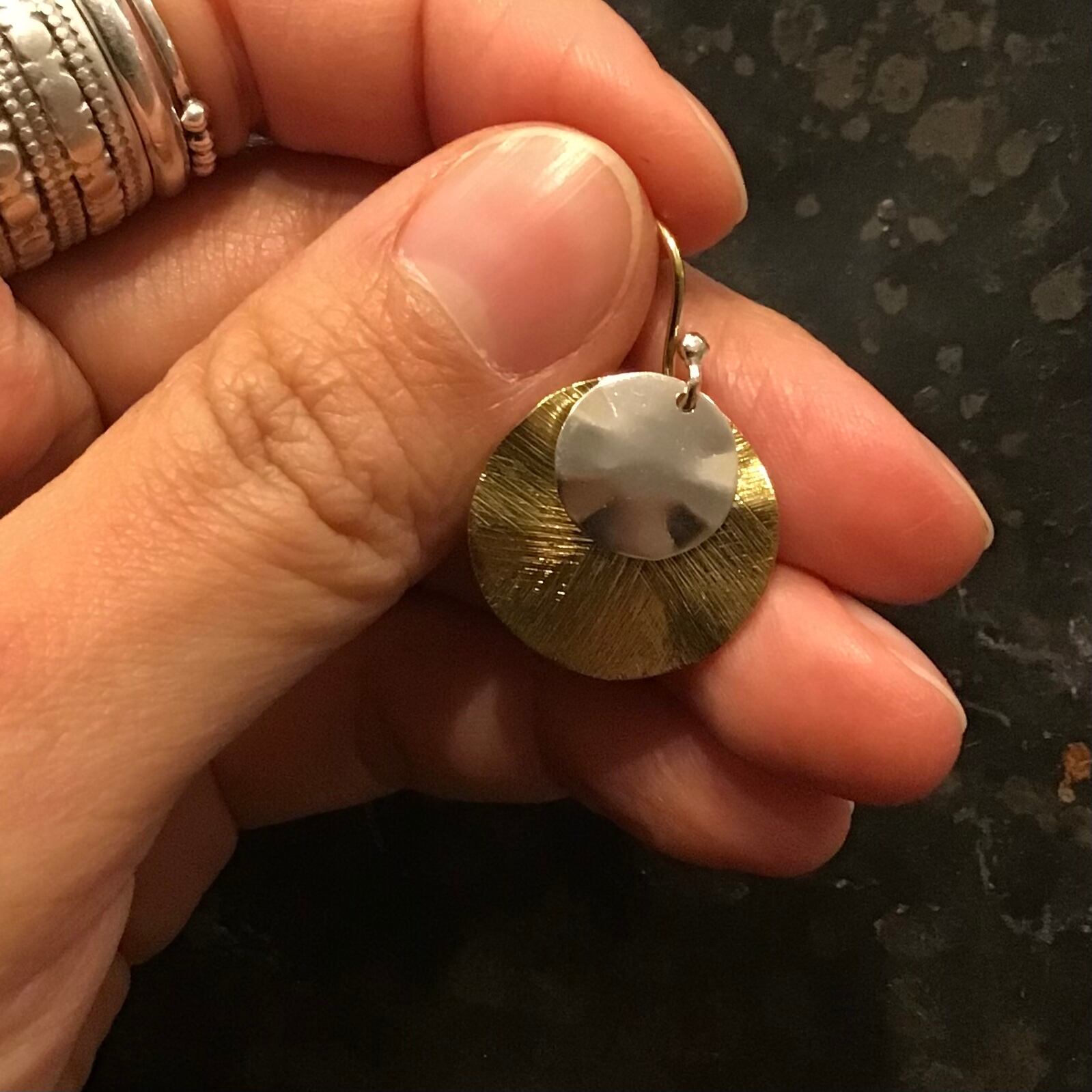 真鍮とシルバーのレイヤードデザインです。真鍮の表面仕上げに拘った逸品。シルバーがレイヤードされていることで、他のアクセサリーの色合わせにも悩みません。